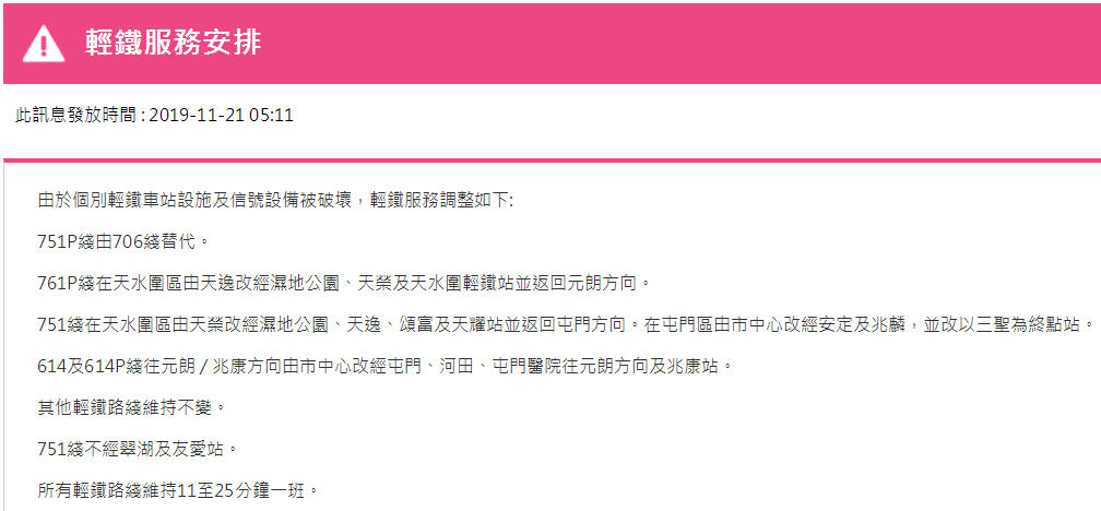 據(jù)港鐵消息,11月21日,香港地鐵各線(機場快線除外)、輕鐵及港鐵巴士的服務(wù)將于晚上11時結(jié)束。西鐵線/東鐵線紅磡站及大學站繼續(xù)關(guān)閉。需要注意的是,元朗站將于下午2時關(guān)閉,列車不停元朗站,此外,個別車站出入口會暫時關(guān)閉。