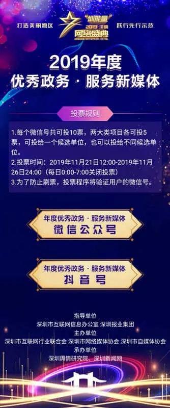 為盤(pán)點(diǎn)行業(yè)一年來(lái)取得的新探索、新成就、新經(jīng)驗(yàn),唱響主旋律,弘揚(yáng)正能量,“‘圳能量’2019深圳網(wǎng)絡(luò)盛典”——暨深圳年度優(yōu)秀政務(wù)·服務(wù)新媒體活動(dòng)將于2019年12月6日隆重舉行。