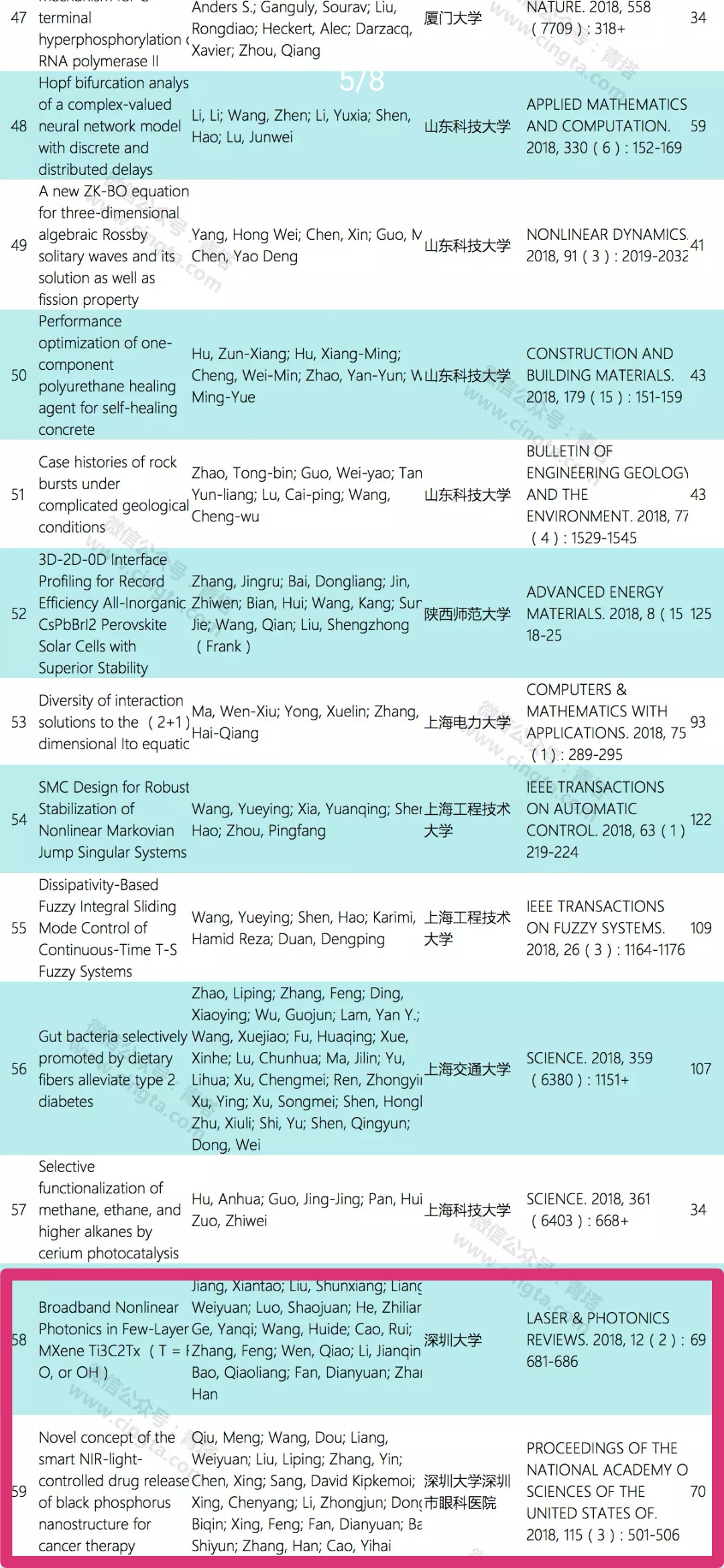 張晗教授課題組入選的2篇論文分別為《Broadband Nonlinear Photonics in Few-Layer MXene Ti3C2Tx (T = F, O, or OH)(新型智能近紅外光控黑磷納米結(jié)構(gòu)釋藥系統(tǒng)用于癌癥治療)》,所屬機構(gòu)為深圳大學(xué),來源期刊為《LASER & PHOTONICS REVIEWS.2018,12(2):681-686(美國科學(xué)院院刊)》,被引次數(shù)69;《Novel concept of the smart NIR-light-controlled drug release of black phosphorus nanostructure for cancer therapy(少層MXene納米片中的非線性光子學(xué))》,所屬機構(gòu)為深圳大學(xué)深圳市眼科醫(yī)院,來源期刊為《PROCEEDINGS OF THE NATIONAL ACADEMY OF SCIENCES OF THE UNITED STATES OF.2018,115(3):501-506(激光光子學(xué)評論)》,被引次數(shù)70。