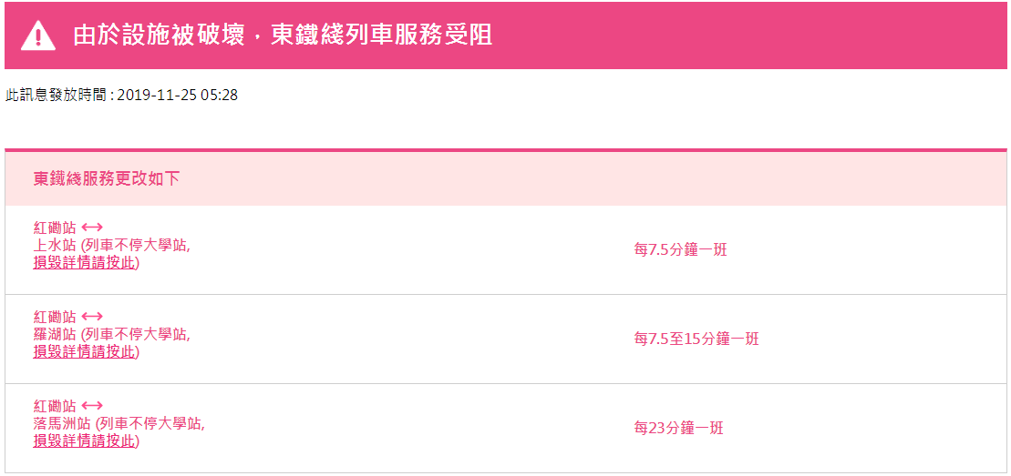 據(jù)港鐵消息,11月25日,香港地鐵各線(xiàn)(機(jī)場(chǎng)快線(xiàn)除外)、輕鐵及港鐵巴士的服務(wù)將于晚上11時(shí)結(jié)束。紅磡站恢復(fù)列車(chē)服務(wù),但只開(kāi)放B、C出入口。大學(xué)站繼續(xù)關(guān)閉,列車(chē)不停大學(xué)站,個(gè)別車(chē)站出入口也會(huì)暫時(shí)關(guān)閉。