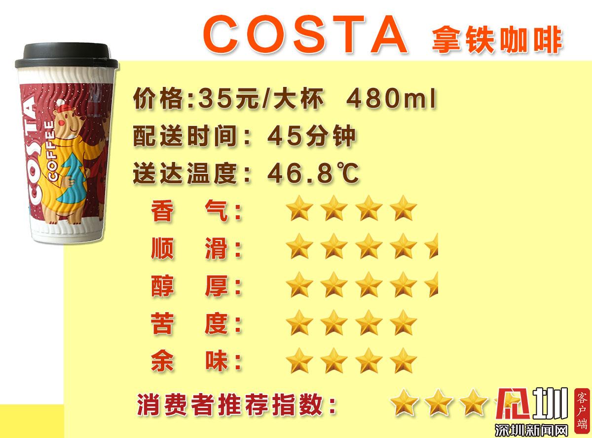 綜合“拿鐵咖啡(熱)”主觀評測的5個(gè)維度(香氣、順滑、醇厚、苦度、余味),最終瑞幸在消費(fèi)者推薦指數(shù)評分中脫穎而出收獲5星好評,星巴克收獲4星半好評位居第二,Costa4、太平洋僅獲得4星評價(jià)。