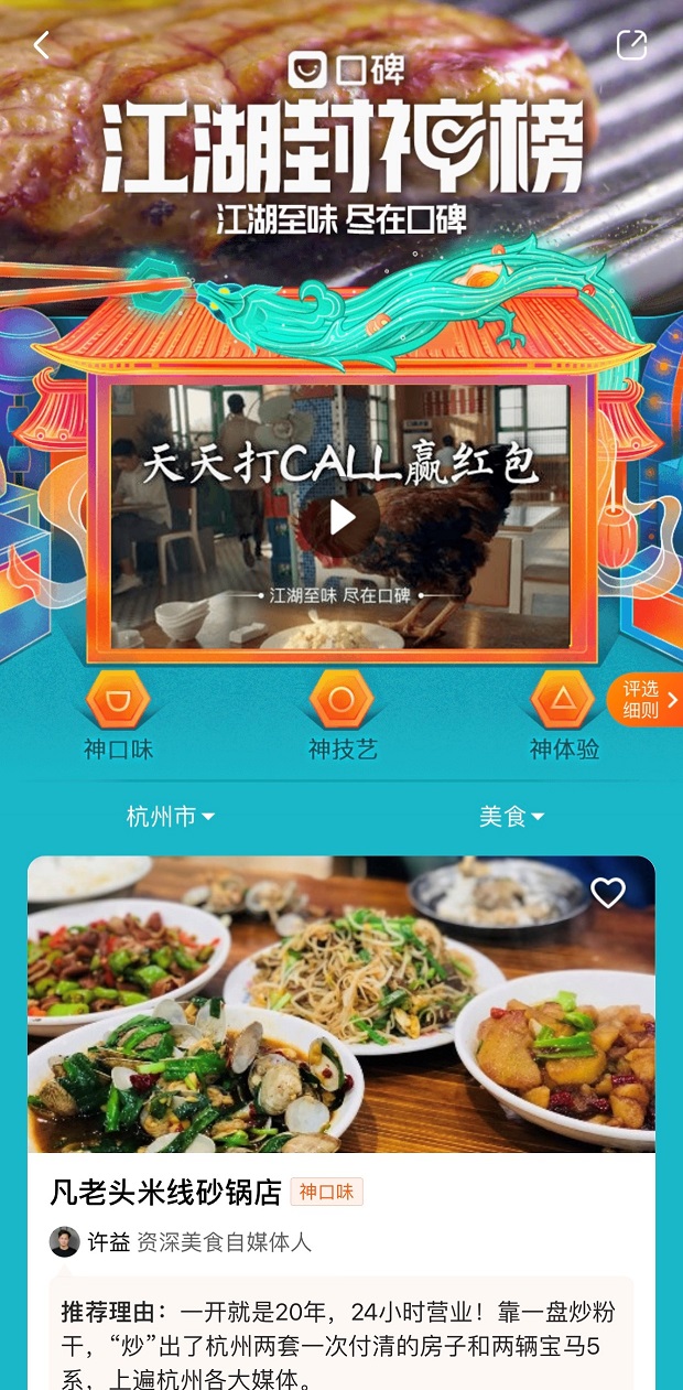 今年“雙12”,口碑餓了么首次發(fā)布“江湖封神榜”,入圍店鋪先由美食體驗者、觀察家、媒體團在內(nèi)的本地評審團先提名,再經(jīng)過阿里本地生活大數(shù)據(jù)進行智能評分,同時邀請眾多消費者投票驗名“真身“。商戶上榜不靠流量,不用刷單,也不必擔心惡意差評影響流量和排名。消費者就算沒有本地老餮帶路,參考“江湖封神榜”就能找到地道美食。目前,首批入選的1730家店鋪,分布在北京、杭州、成都、廣州等13座城市。消費者通過口碑a(chǎn)pp上選擇相應(yīng)的城市坐標,點擊“江湖封神榜”,就可以找到推薦好店。