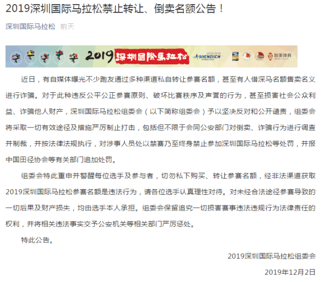 12月2日,深馬組委會(huì)發(fā)布公告,對(duì)于此種違反公平公正參賽原則、破壞比賽秩序及聲譽(yù)的行為,甚至損害社會(huì)公眾利益、詐騙他人財(cái)產(chǎn),深圳國(guó)際馬拉松組委會(huì)(以下簡(jiǎn)稱組委會(huì))予以堅(jiān)決反對(duì)和公開(kāi)譴責(zé)。
