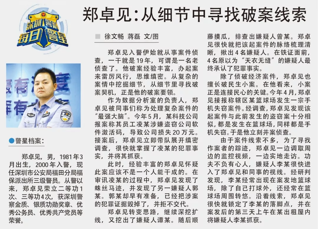 鄭卓見,男,1981年3月出生,2000年入警,現(xiàn)任深圳市公安局福田分局福保派出所三級(jí)警員。從警以來(lái),鄭卓見榮立二等功1次、三等功4次,獲深圳警察金質(zhì)、銀質(zhì)功勛獎(jiǎng)?wù)?、?yōu)秀公務(wù)員、優(yōu)秀共產(chǎn)黨員等榮譽(yù)。
