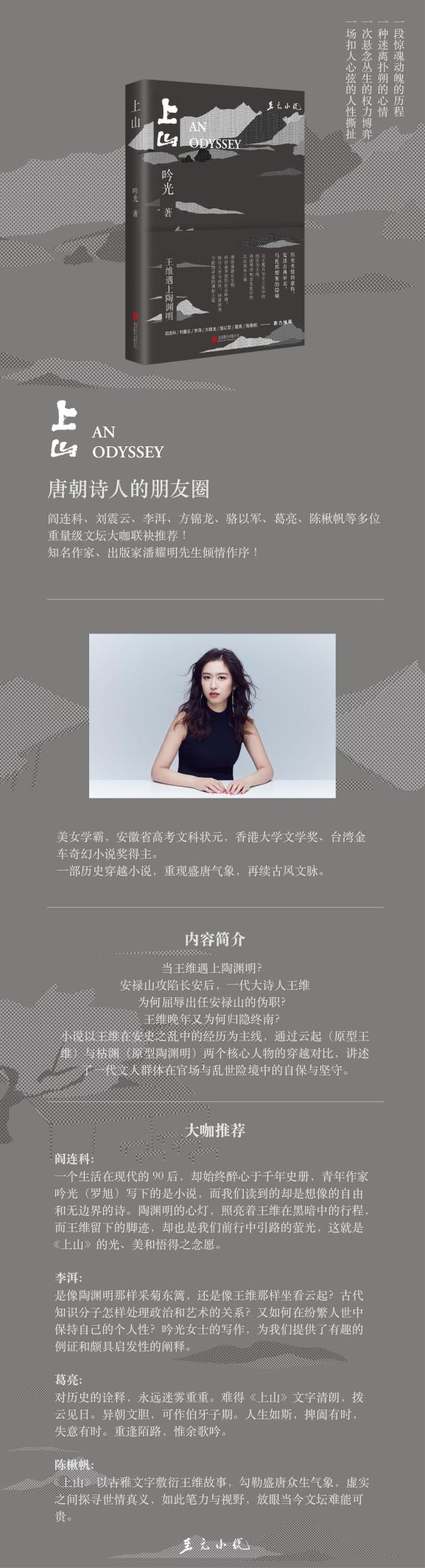 著名作家閻連科表示:“一個(gè)生活在現(xiàn)代的90后,卻始終醉心于千年史冊(cè),青年作家吟光(羅旭)寫下的是小說(shuō),而我們讀到的卻是想像的自由和無(wú)邊界的詩(shī)。陶淵明的心燈,照亮著王維在黑暗中的行程;而王維留下的腳跡,卻也是我們前行中引路的螢光。這就是《上山》的光、美和悟得之念愿?!?/p>