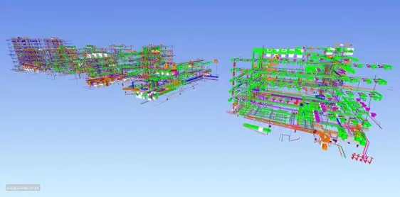 在施工準(zhǔn)備階段,優(yōu)化原設(shè)計(jì)圖紙,提前解決施工階段遇到的問題,實(shí)現(xiàn)BIM深化圖指導(dǎo)現(xiàn)場(chǎng)施工放樣及管道安裝,滿足規(guī)范及空間使用要求;施工實(shí)施階段,基于BIM深化模型輸出工程量清單,輔助材料管理人員物資采購(gòu)管理,支架深化及輸出加工圖,推進(jìn)項(xiàng)目精細(xì)化管理。
