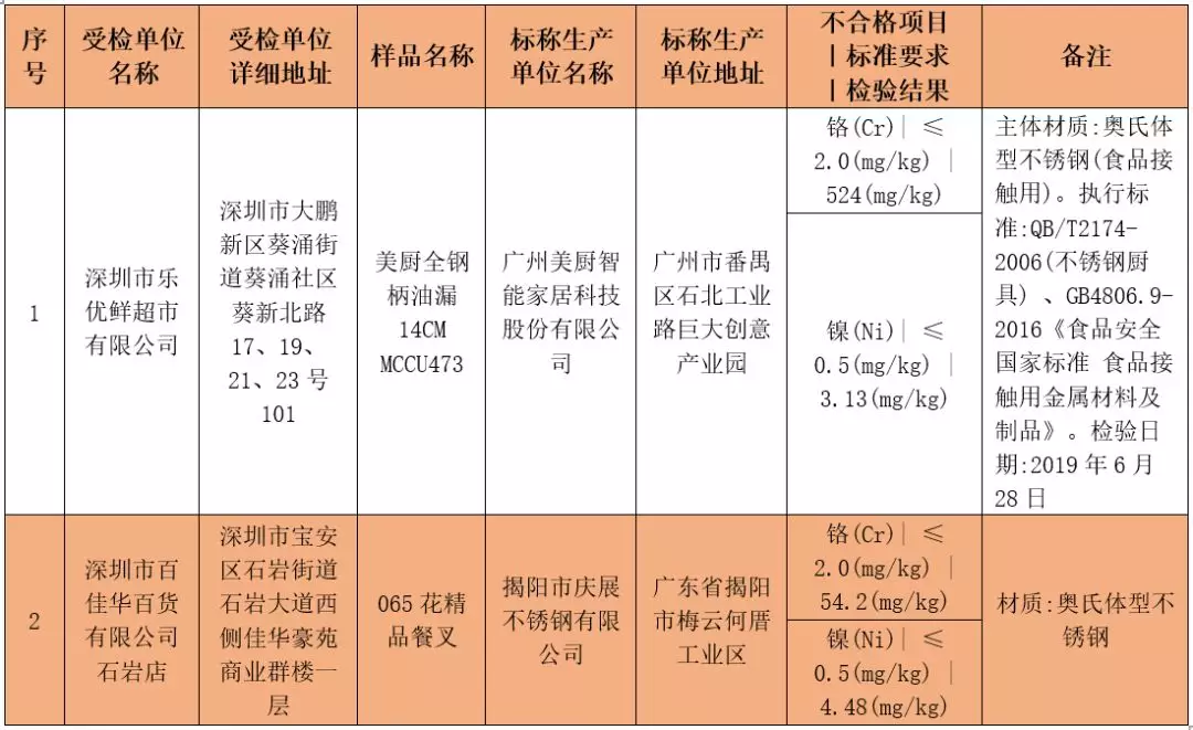 本次共抽檢生產(chǎn)及流通環(huán)節(jié)食品相關(guān)產(chǎn)品1174批次,涉及生產(chǎn)、流通環(huán)節(jié)經(jīng)營主體256家,共檢測相關(guān)指標6822項次。其中檢出不合格樣品2批次,涉及2家受檢單位,均來自流通領(lǐng)域企業(yè);涉及不合格產(chǎn)品類別均為食品接觸用金屬材料及制品;涉及不合格項目均為鎳(Ni)、鉻(Cr)。