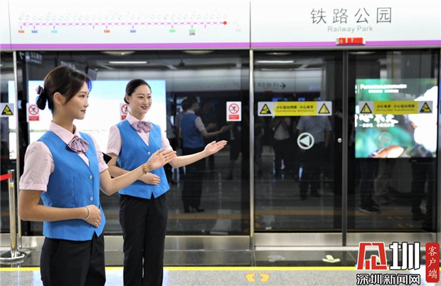 深圳地鐵5號(hào)線二期開通首日,地鐵工作人員歡迎市民乘坐地鐵。