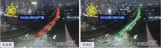 針對(duì)此問(wèn)題,蜀黍?qū)|西方向單放搭接直行信號(hào)燈調(diào)整為東西單放,在保證路口正常通行的前提下,縮短了東西方向的通行時(shí)間。優(yōu)化后,東西方向綠燈空放的問(wèn)題得以解決,北方向車輛排隊(duì)時(shí)間明顯減少,路口通行效率得到提高。