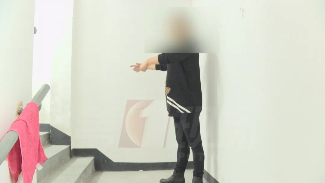 ▲方女士在事發(fā)樓道內(nèi)講述經(jīng)過