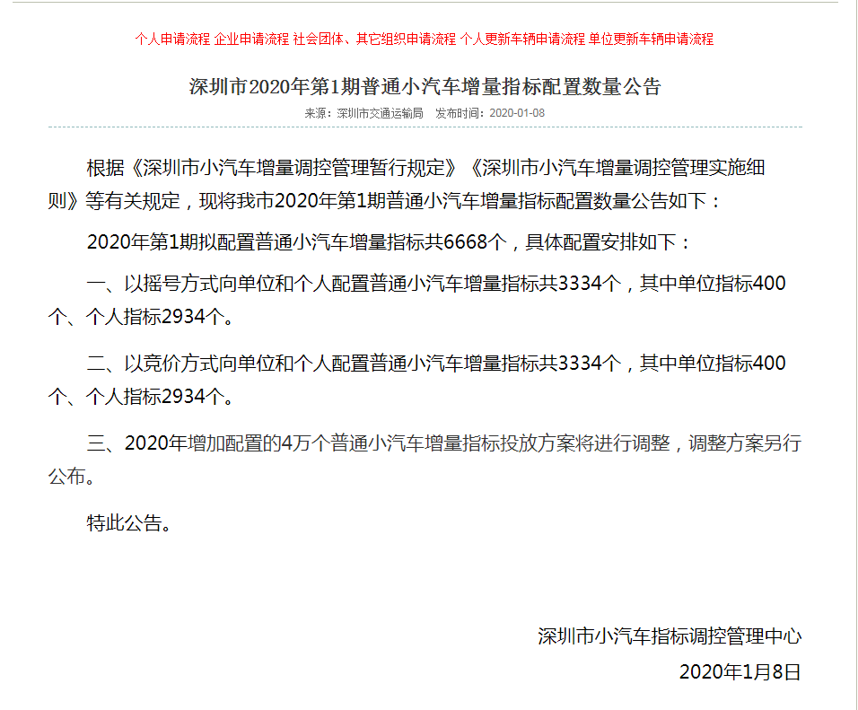 2020年深圳首期小汽車搖號競價推遲一周,順延至節(jié)后第一個工作日1月31日。