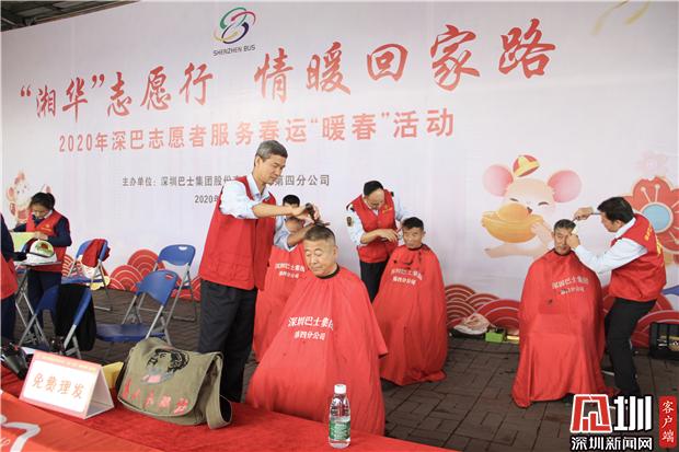 深圳巴士集團(tuán)志愿者為春運(yùn)返鄉(xiāng)旅客理發(fā)。