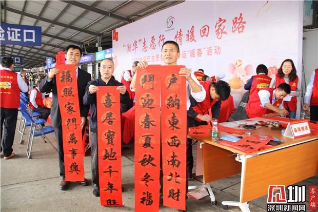 深圳巴士集團(tuán)志愿者現(xiàn)場(chǎng)寫春聯(lián)贈(zèng)給返鄉(xiāng)旅客。