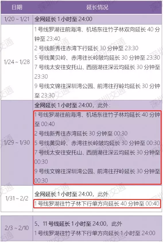 1月24日(除夕)至2月2日(正月初九)共10天,深圳地鐵全線網(wǎng)車站均提早運營10-15分鐘