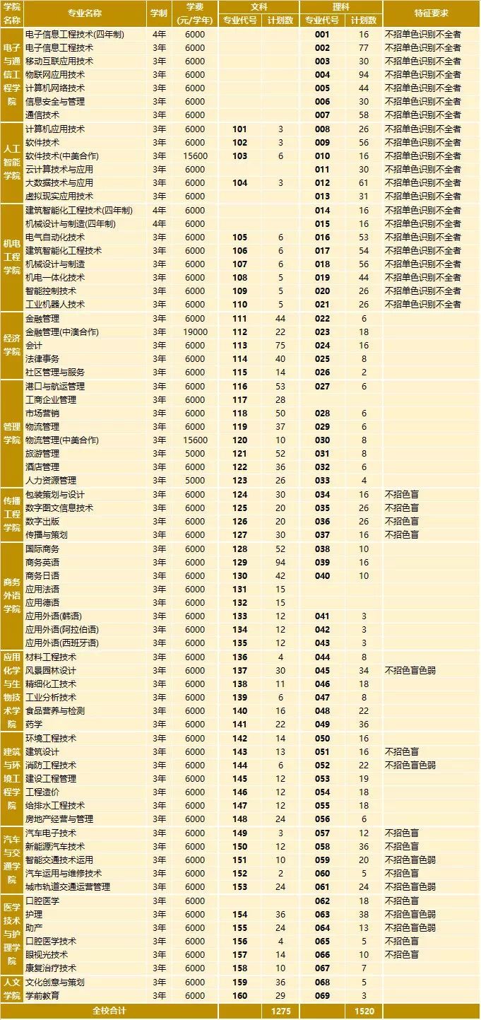 ②以下各招生專業(yè)、專業(yè)代號(hào)、計(jì)劃數(shù)、選報(bào)證書、特征要求等及其它備注以廣東省招生辦公布的專業(yè)目錄為準(zhǔn);