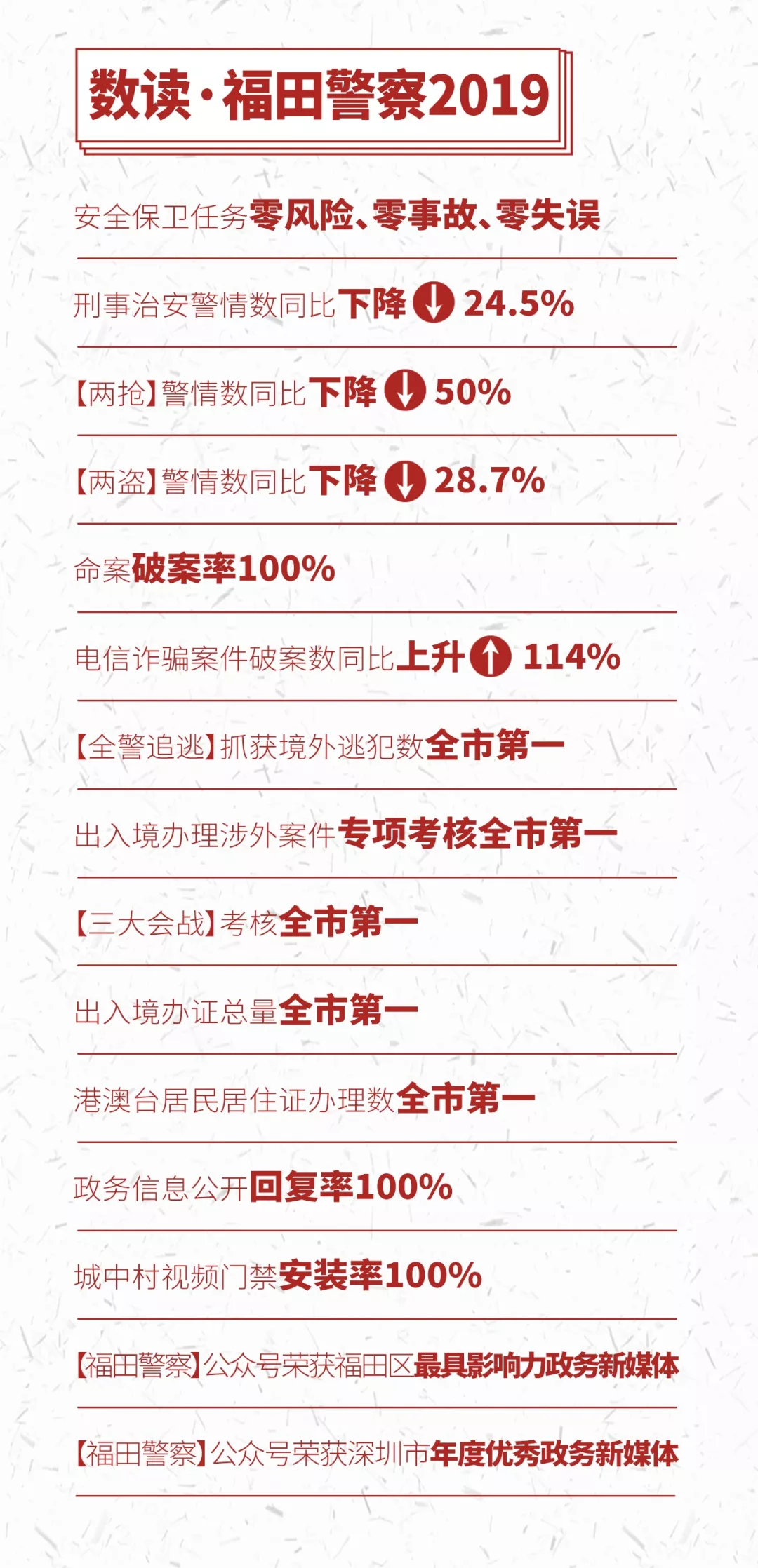 剛剛過(guò)去的2019年,是福田公安勇?lián)姑?,砥礪奮進(jìn)的一年,在市局黨委和區(qū)委區(qū)政府的堅(jiān)強(qiáng)領(lǐng)導(dǎo)下,福田公安穩(wěn)中求進(jìn)、攻堅(jiān)克難,穩(wěn)妥應(yīng)對(duì)化解系列重大風(fēng)險(xiǎn),有效護(hù)航中心城區(qū)社會(huì)政治穩(wěn)定,打贏新中國(guó)成立70周年大慶安保和澳門(mén)回歸20周年慶典安保攻堅(jiān)戰(zhàn),各項(xiàng)重大安保活動(dòng)“零風(fēng)險(xiǎn)、零事故、零失誤”;強(qiáng)力推進(jìn)掃黑除惡、“颶風(fēng)2019”等一系列專項(xiàng)行動(dòng),合成打擊效能突顯;持續(xù)推動(dòng)現(xiàn)代化警務(wù)機(jī)制變革,改革攻堅(jiān)蹄疾步穩(wěn);提升社會(huì)治安基礎(chǔ)治理工作,治安面貌持續(xù)向好;隊(duì)伍建設(shè)舉措剛?cè)嵯酀?jì),錘煉“四個(gè)鐵一般”的過(guò)硬警隊(duì)。