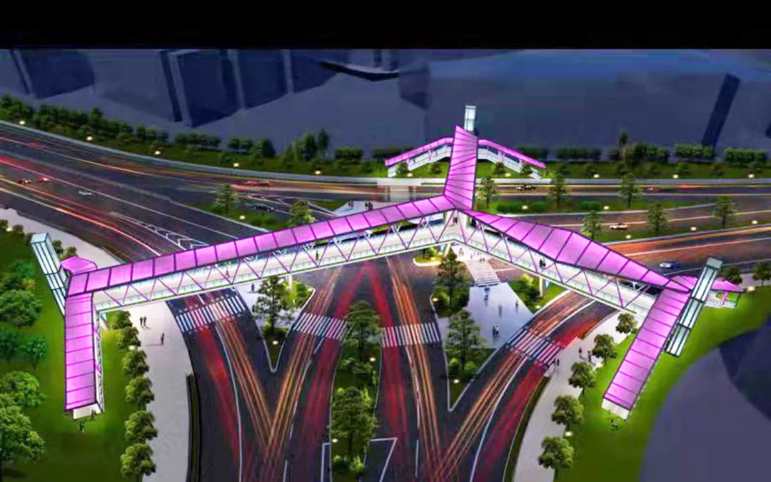 據(jù)介紹,東濱路人行天橋項(xiàng)目位于南山區(qū)東濱路與南山大道的三岔路口,經(jīng)前期多個(gè)概念性方案設(shè)計(jì)比選,最終采用三個(gè)方向主梁互為 120°交角的“Y”形方案,共計(jì) 6座鋼結(jié)構(gòu)梯道和3部垂直電梯。完工后,這座漂亮的人行天橋或?qū)⒊蔀槭忻翊蚩ǖ木W(wǎng)紅景點(diǎn)。