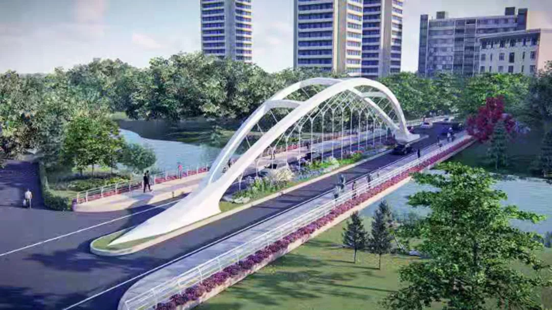 凌菊路項(xiàng)目位于南方科技大學(xué)校園內(nèi),南起學(xué)苑大道,北至二線(xiàn)公路,全長(zhǎng)約950m,雙向兩車(chē)道,是南方科技大學(xué)急需建設(shè)的教師周轉(zhuǎn)公寓和醫(yī)學(xué)院車(chē)輛進(jìn)出的唯一通道。道路采用下承式拱結(jié)構(gòu)鋼橋一跨過(guò)大沙河,橋梁跨度62m,全長(zhǎng)63.7m。