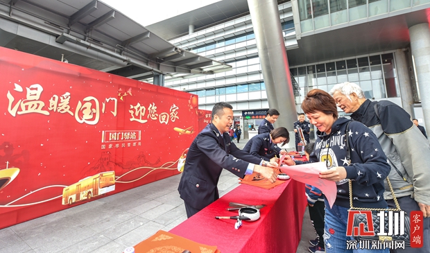 皇崗邊檢站民警用熱情的中國紅營造濃郁的“年味兒”,以親切的問候帶給返鄉(xiāng)過年的旅客回家的溫暖,現(xiàn)場有不少在外務(wù)工人員、港澳臺同胞、外籍旅客寫下“國泰民安”的美好心愿,與民警們一同揮毫潑墨,迎春送福。