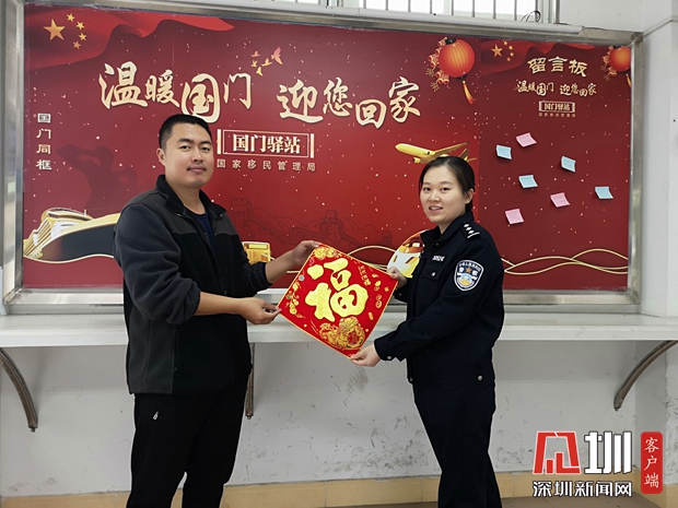 沙頭角邊檢站特別拍攝春節(jié)宣傳片,在口岸多個場地播放,營造“年”的氛圍,為出入境旅客送上小燈籠、“福”字等小禮品,與旅客在執(zhí)勤現(xiàn)場合影,并當(dāng)場打印出照片贈與留念,讓每一位歸家的游子第一時間感受到祖國的溫暖和春節(jié)的幸福。