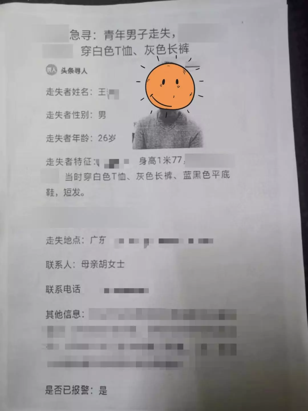 “找著了!找著了!”1月20日下午17時許,自1月13日走失的患病青年男子,在深圳某中學(xué)附近天橋平安找回,此時,離走失人員父母到福田派出所報案,不到30分鐘找回走失人員!