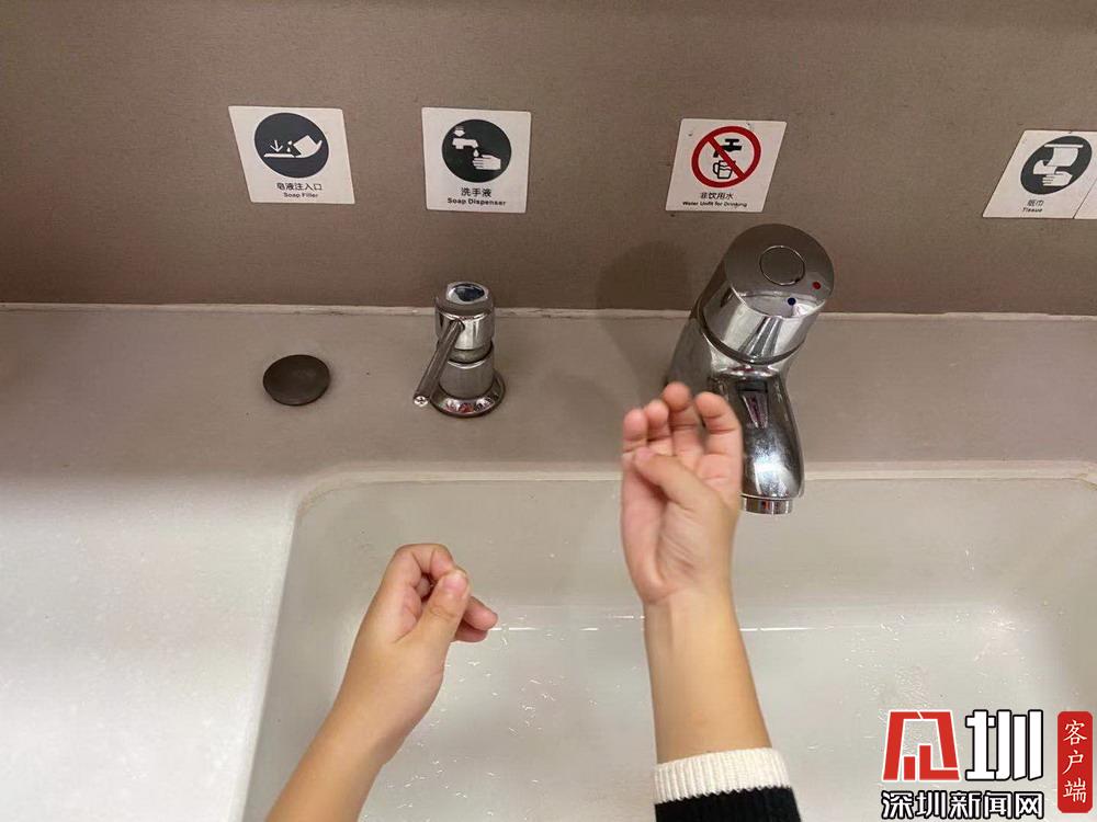 我好像聽(tīng)見(jiàn)我的肚子開始叫了,媽媽讓我先洗手才能吃東西。洗手池這里有洗手液和一次性擦手紙,水都是溫的,洗手的時(shí)候很舒服。見(jiàn)圳客戶端、深圳新聞網(wǎng)記者 劉婷 攝