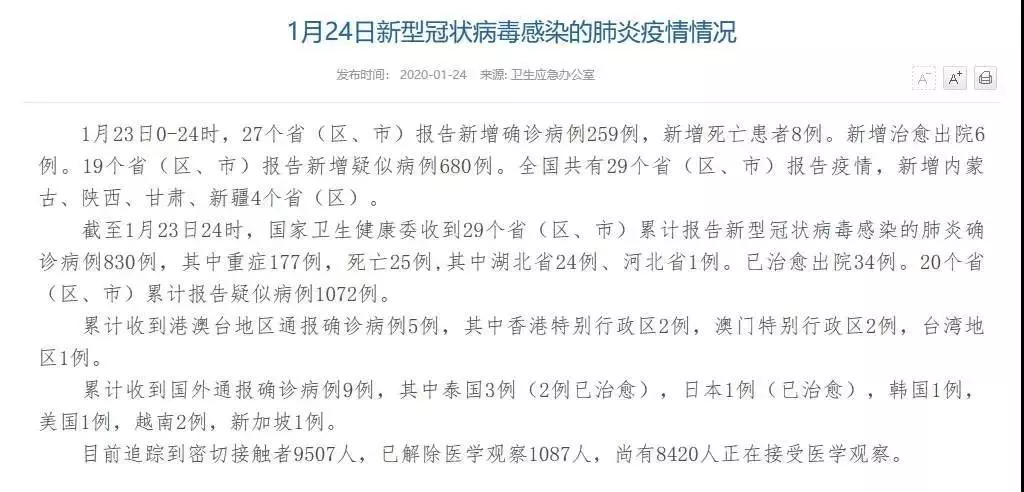 國家衛(wèi)建委通報(bào):1月23日0-24時(shí),27個(gè)?。▍^(qū)、市)報(bào)告新增確診病例259例,新增死亡患者8例。新增治愈出院6例。19個(gè)省(區(qū)、市)報(bào)告新增疑似病例680例。全國共有29個(gè)?。▍^(qū)、市)報(bào)告疫情,新增內(nèi)蒙古、陜西、甘肅、新疆4個(gè)?。▍^(qū))。