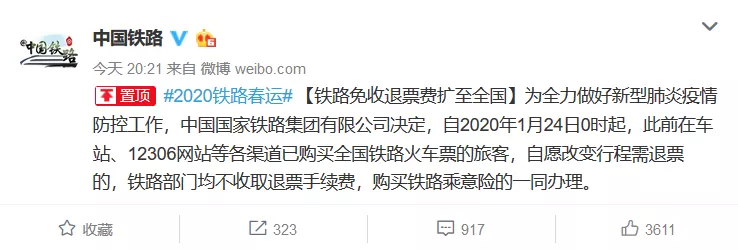 【鐵路免收退票費(fèi)擴(kuò)至全國】為全力做好新型肺炎疫情防控工作,中國國家鐵路集團(tuán)有限公司決定,自2020年1月24日0時(shí)起,此前在車站、12306網(wǎng)站等各渠道已購買全國鐵路火車票的旅客,自愿改變行程需退票的,鐵路部門均不收取退票手續(xù)費(fèi),購買鐵路乘意險(xiǎn)的一同辦理。
