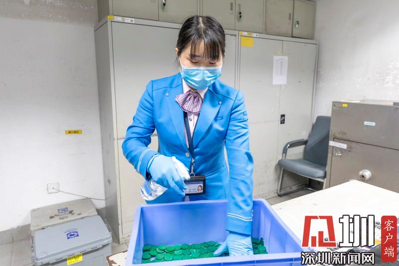 深圳地鐵車站工作人員對地鐵票卡進(jìn)行消毒。