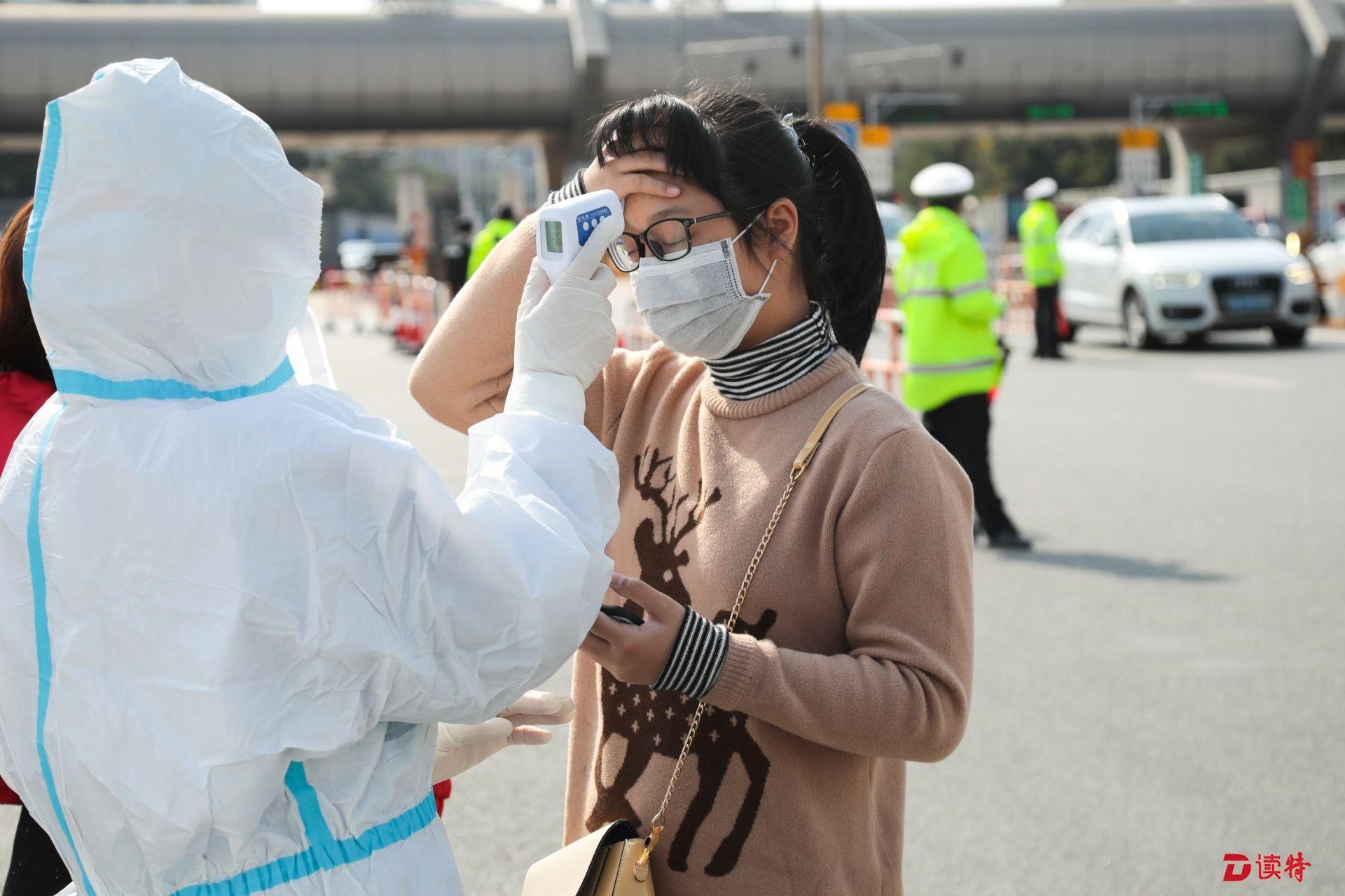 返深市民在交通檢疫點(diǎn)配合測(cè)體溫