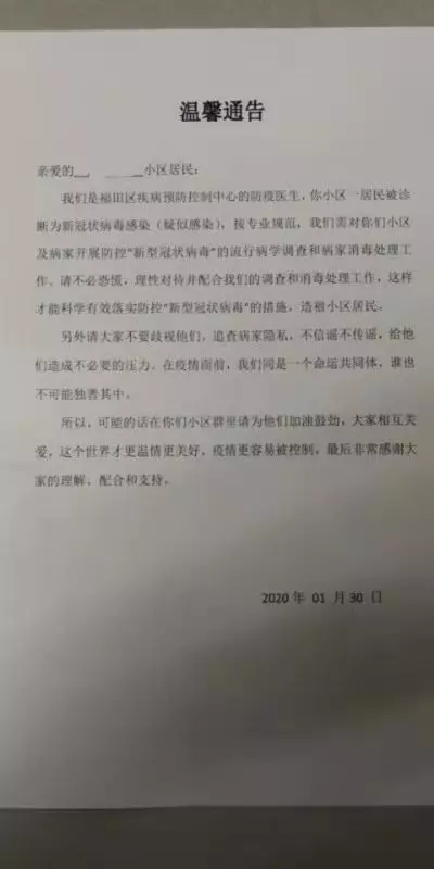 1月30日,由于深圳一小區(qū)出現(xiàn)新冠狀病毒疑似感染病例,福田區(qū)疾病預(yù)防控制中心的防疫醫(yī)生發(fā)布了這則通告。通告除了呼吁小區(qū)居民配合調(diào)查及消毒處理工作外,還特地懇請大家“不要歧視,在疫情面前,我們是同一個命運(yùn)共同體,誰也不可能獨(dú)善其身。”不知為何,雖不是湖北人也未曾受過歧視,但還是被這寥寥數(shù)字的“請求”溫暖了。