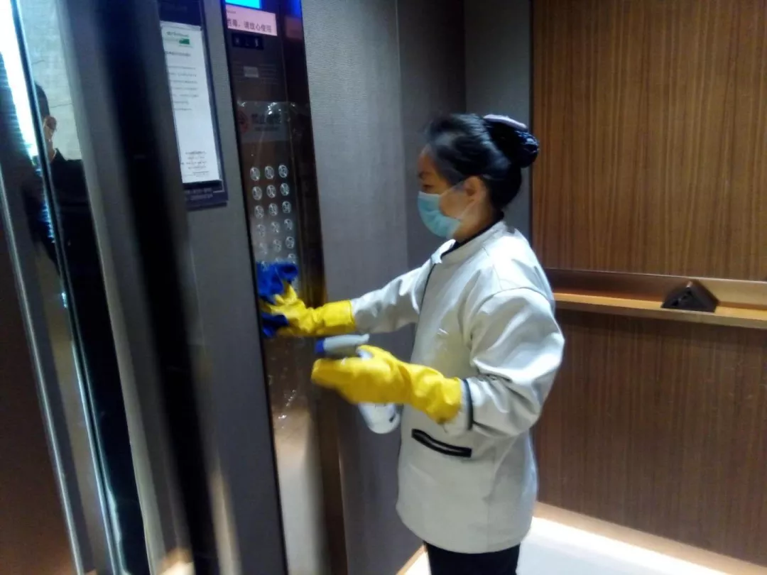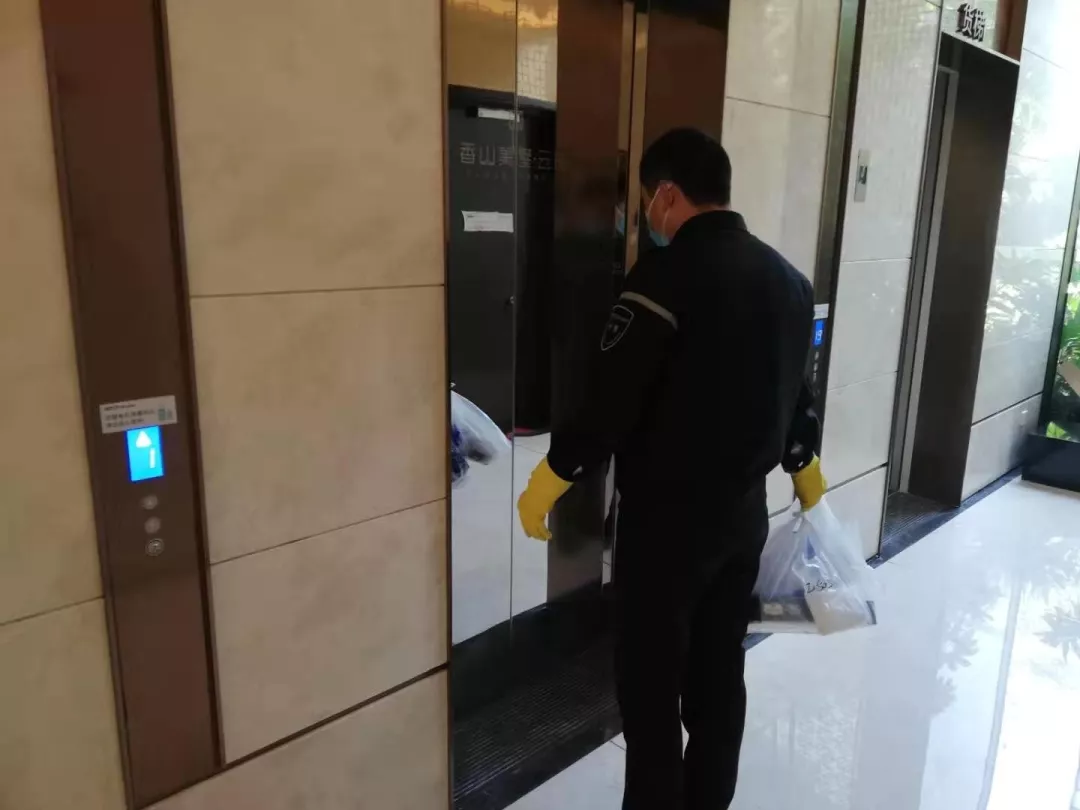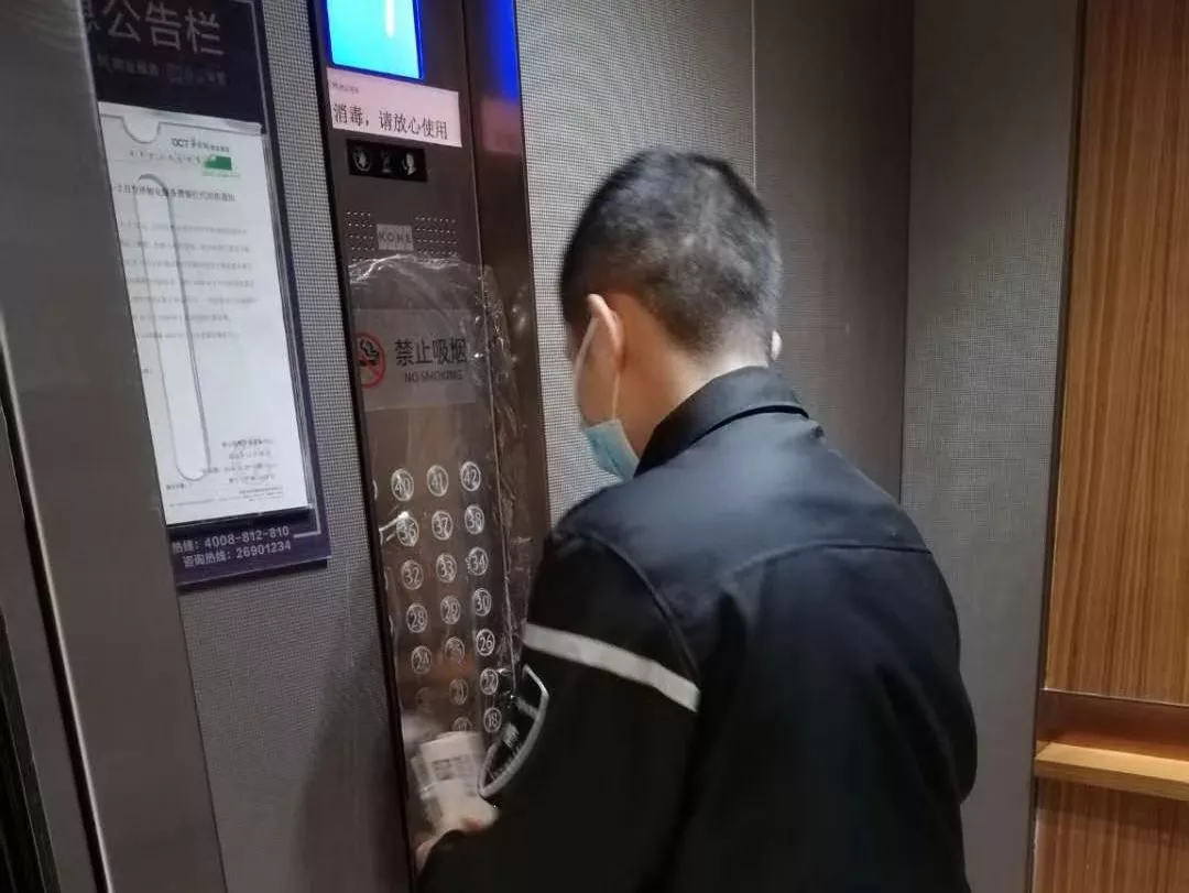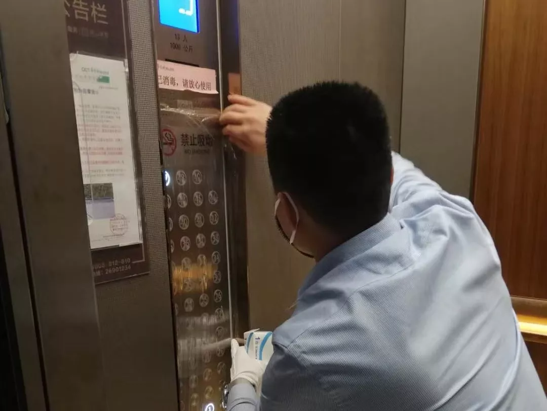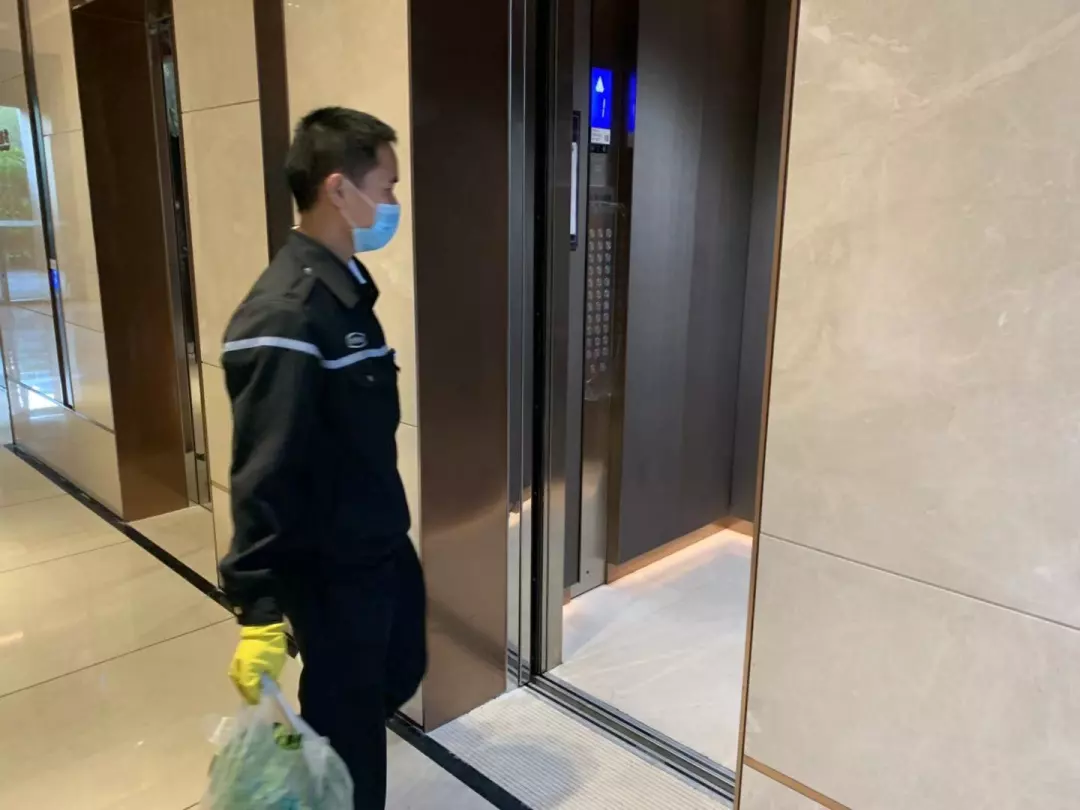 每天對小區(qū)公共區(qū)域大堂門把手、門禁對講機(jī)、電梯按鍵、大堂茶幾沙發(fā)等高頻接觸區(qū)進(jìn)行消毒及對轎廂按鈕定時更換保鮮貼膜。