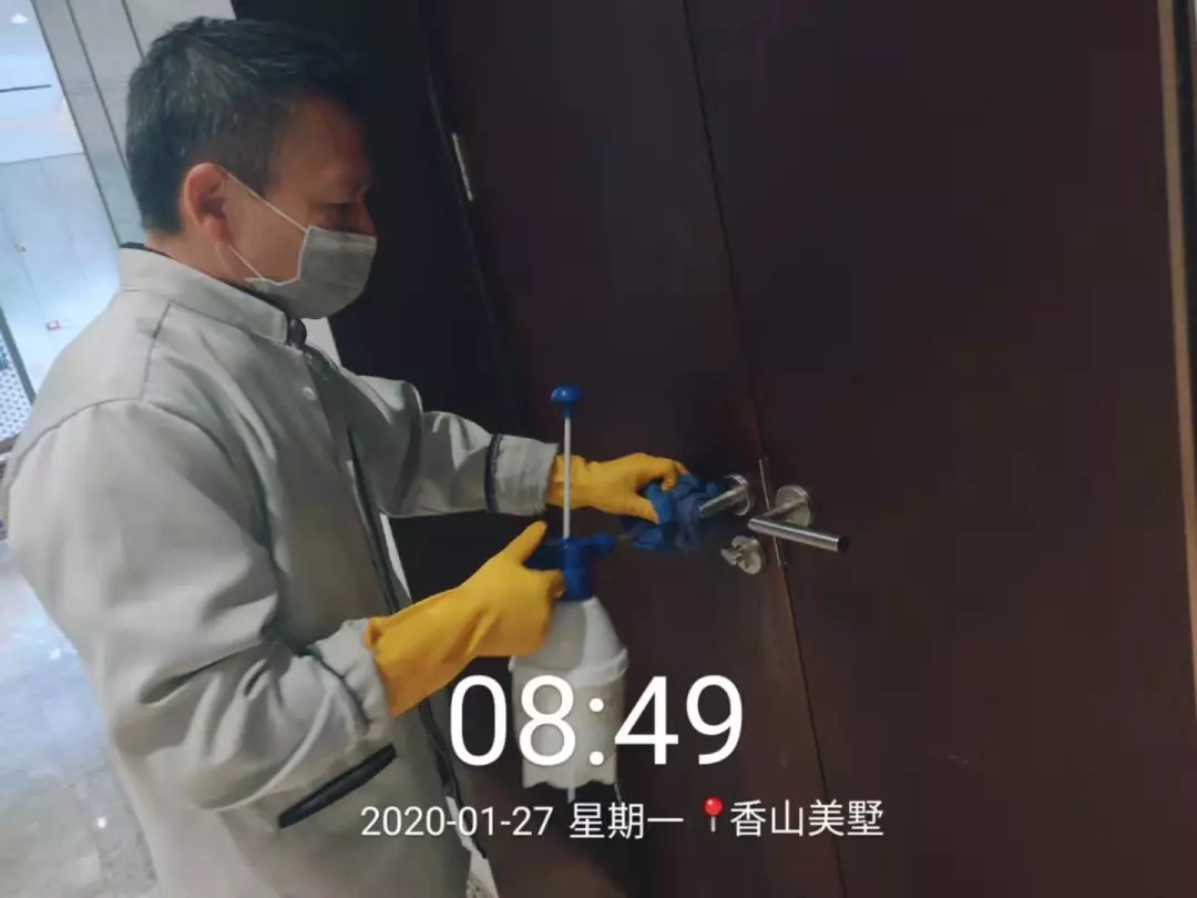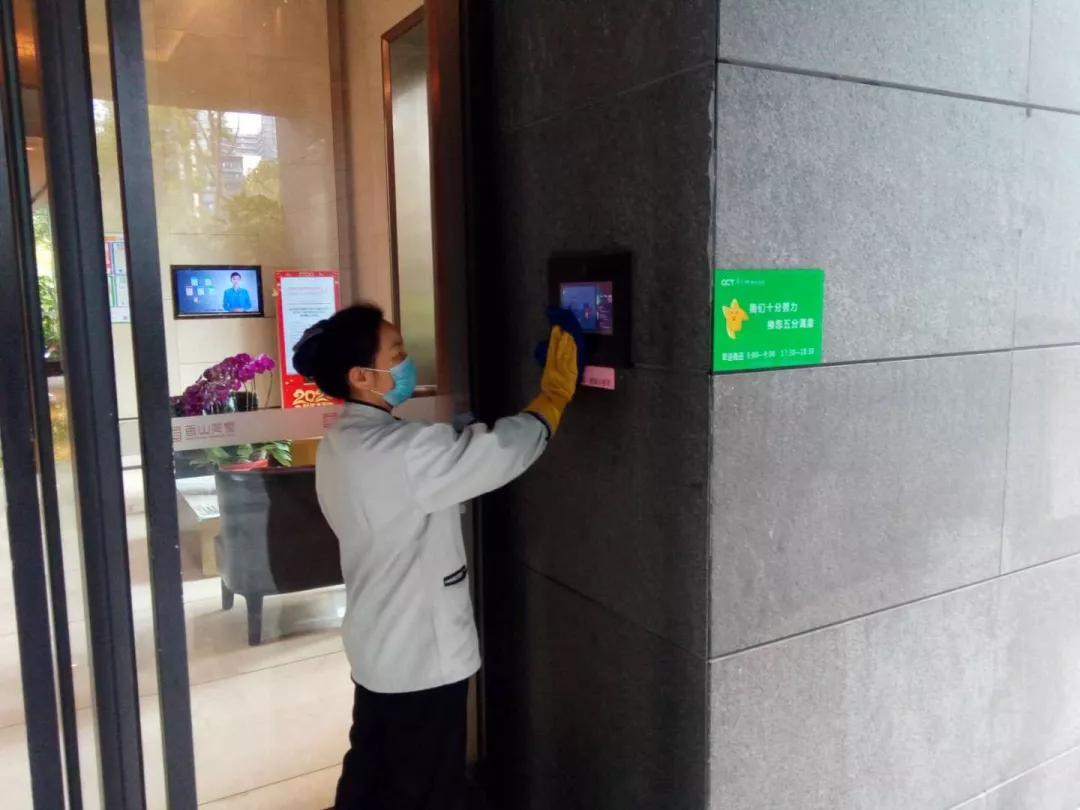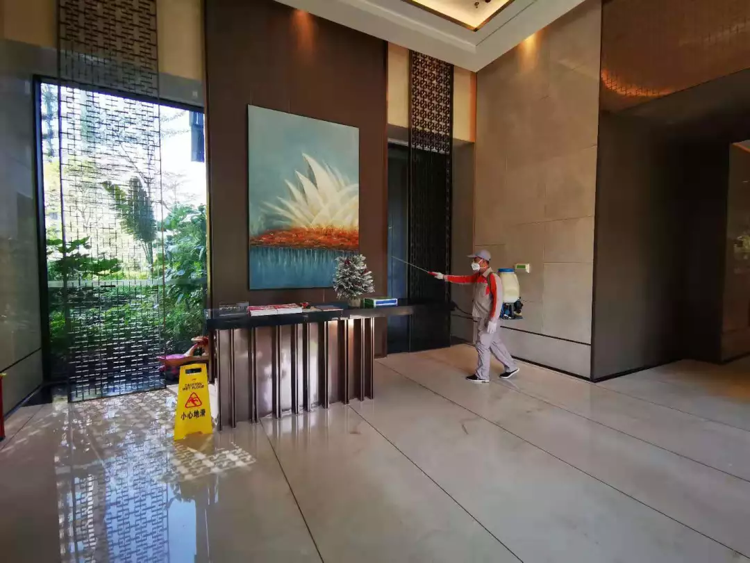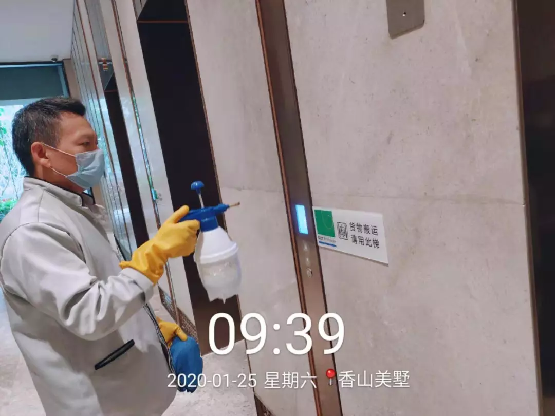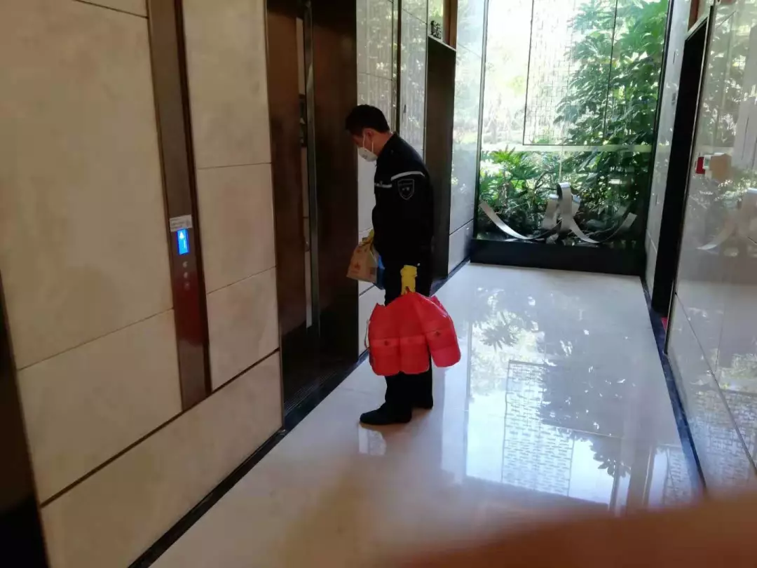 每天對小區(qū)公共區(qū)域大堂門把手、門禁對講機(jī)、電梯按鍵、大堂茶幾沙發(fā)等高頻接觸區(qū)進(jìn)行消毒及對轎廂按鈕定時更換保鮮貼膜。