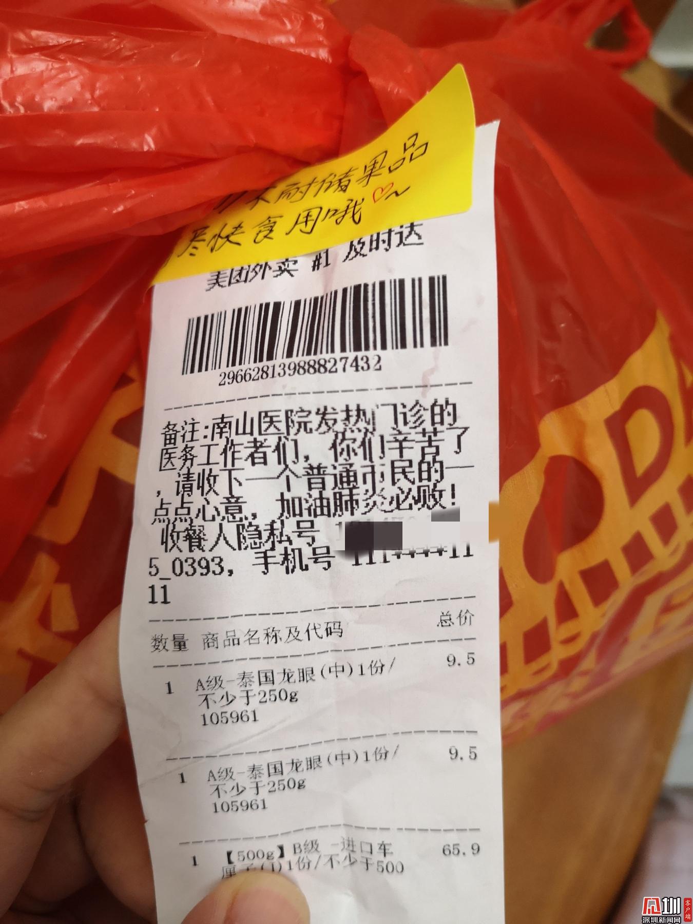 見圳客戶端·深圳新聞網(wǎng)2020年2月1日訊 (見圳客戶端、深圳新聞網(wǎng)記者 劉夢婷 通訊員 深協(xié)和)“老淚縱橫!”1月30日晚上8點56分,華中科技大學協(xié)和深圳醫(yī)院(南山醫(yī)院)手外科護士王敏在朋友圈曬了一張照片,瞬時網(wǎng)友們紛紛點贊。照片里是一個紅色塑料袋上貼著一張外賣單,備注上寫著,“南山醫(yī)院發(fā)熱門診的醫(yī)務工作者們,你們辛苦了!請收下一個普通市民的一點點心意,加油,肺炎必??!”