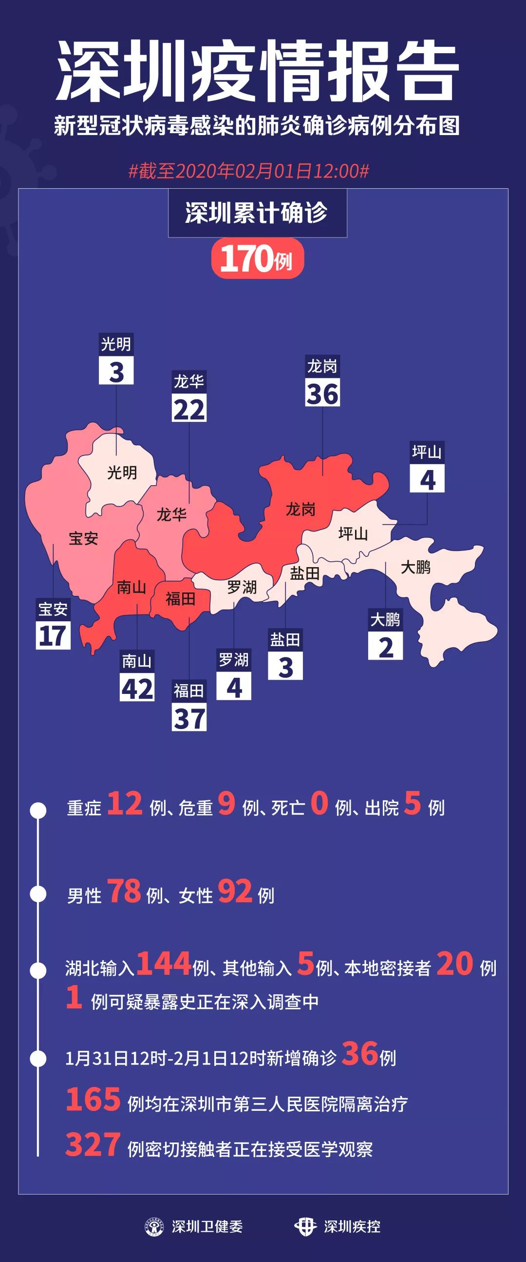 深圳病人糞便中檢出病毒陽(yáng)性 2月1日晚,深圳市第三人民醫(yī)院透露,該院肝病研究所發(fā)現(xiàn),在某些新型冠狀病毒感染的肺炎確診患者的糞便中檢測(cè)出2019-nCoV核酸(新型冠狀病毒)陽(yáng)性,很有可能提示糞便中有活病毒存在。目前研究人員正在做進(jìn)一步分離病毒的研究。 此外,國(guó)際醫(yī)學(xué)期刊《新英格蘭醫(yī)學(xué)雜志》最新刊登的一篇文章也透露,醫(yī)生們?cè)诿绹?guó)首位“新型肺炎”病人的腹瀉糞便樣本中檢測(cè)出了新型冠狀病毒的存在(rRT-PCR結(jié)果陽(yáng)性)。 在此提醒市民,一定要更加注意勤洗手,尤其是便后、飯前,一定要用流水+肥皂或洗手液,洗手20秒以上。 1月31日12時(shí)至2月1日12時(shí),深圳新增36個(gè)確診病例 病例135 47歲女性患者,常住北京。1月15日前往武漢探親,22日乘私家車(chē)前往深圳。1月23日發(fā)病,1月27日入院,目前情況穩(wěn)定。 病例136 病例98的女兒 4歲女性患者,常住湖北省十堰市。在密切接觸者采樣檢測(cè)中,發(fā)現(xiàn)新型冠狀病毒陽(yáng)性,故于1月27日入院,目前情況穩(wěn)定。 病例97:64歲男性患者,常住于湖北省十堰市。2020年1月22日抵達(dá)深圳,24日發(fā)病,26日入院就診。 病例98(病例97的兒子):40歲男性患者,常住于深圳市龍崗區(qū)。2020年1月22日,父親從湖北抵達(dá)深圳,24日發(fā)病,26日入院就診。 病例137 56歲男性患者,常住湖北省武漢市。1月21號(hào)前往深圳。1月26日發(fā)病,1月28日入院,目前情況穩(wěn)定。 病例138 59歲男性患者,常住深圳市龍華區(qū)。1月16日自駕從深圳前往武漢,1月23日開(kāi)車(chē)回到深圳。1月26日發(fā)病,當(dāng)日入院,目前情況穩(wěn)定。 病例139 病例138妻子 57歲女性患者,常住深圳市龍華區(qū)。1月16日自駕深圳前往武漢,1月23日開(kāi)車(chē)回到深圳。1月24日發(fā)病,1月26日入院,目前情況穩(wěn)定。 病例140 66歲女性患者,常住湖北省武漢市。1月22日前往深圳。1月23日發(fā)病,1月28日入院,目前情況穩(wěn)定。 病例141 78歲男性患者,常住湖北省武漢市。1月16日前往深圳探親。1月26日發(fā)病,1月27日入院,目前情況穩(wěn)定。 病例142 61歲女性患者,常住湖北省武漢市。1月21日前往深圳探親。1月22日發(fā)病,1月28日入院,目前情況穩(wěn)定。 病例143 54歲男性患者,常住深圳市南山區(qū)。1月21日前往武漢,23日返回深圳。1月25日發(fā)病,1月28日入院,目前情況穩(wěn)定。 病例144 55歲女性患者,常住深圳市南山區(qū)。1月21日由深圳前往武漢,23日返回深圳。1月24日發(fā)病,1月29日入院,目前情況穩(wěn)定。 病例145 57歲女性患者,常住深圳市南山區(qū)。1月13日從深圳到武漢探親,1月23日從武漢自駕返回深圳。1月26日發(fā)病,1月27日入院,目前情況穩(wěn)定。 病例146 病例29父親 76歲男性患者,常住湖北省武漢市。1月15日從武漢出發(fā)前往廣西南寧旅游,1月18日從廣西南寧出發(fā)前往深圳探親。1月27日發(fā)病,1月28日入院,目前情況穩(wěn)定。 病例29:49歲女性患者,長(zhǎng)期居住湖北武漢,2020年1月15日從武漢到廣西南寧,18日從南寧到佛山,20日從佛山抵達(dá)深圳,21日發(fā)病,22日入院就診。 病例147 病例105的女兒 6歲女性患者,常住深圳市羅湖區(qū)。1月12日前往武漢,1月22日乘私家車(chē)前往河南信陽(yáng),23日乘私家車(chē)前往深圳。在密切接觸者采樣檢測(cè)中發(fā)現(xiàn),新型冠狀病毒陽(yáng)性,故于1月28日入院,目前情況穩(wěn)定。 病例105:35歲男性患者,常住于深圳市羅湖區(qū)。2020年1月17日自駕車(chē)由深圳開(kāi)往武漢,22日自駕車(chē)從武漢開(kāi)往河南信陽(yáng)探親,23日自駕車(chē)從河南信陽(yáng)開(kāi)往深圳,當(dāng)日發(fā)病,25日入院就診。 病例106(病例105妻子):36歲女性患者,常住于深圳市羅湖區(qū)。2020年1月17日乘私家車(chē)由深圳到武漢,22日乘私家車(chē)從武漢到河南信陽(yáng)探親,23日乘私家車(chē)從河南信陽(yáng)到深圳,24日發(fā)病,25日入院就診。 病例107(病例105丈母娘):61歲女性患者,常住于深圳市羅湖區(qū)。1月12日從深圳前往武漢,22日乘私家車(chē)從武漢到河南信陽(yáng)探親,23日乘私家車(chē)從河南信陽(yáng)到深圳,24日發(fā)病,25日入院就診。 病例148 38歲女性患者,常住深圳市福田區(qū)。1月23日接觸從武漢來(lái)深的父母(都未確診)。1月27日發(fā)病,當(dāng)日入院,目前情況穩(wěn)定。 病例149 33歲女性患者,常住深圳市福田區(qū)。1月19日前往武漢,乘私家車(chē)到潛江探親,1月24日乘私家車(chē)返回深圳。1月28日發(fā)病,當(dāng)日入院,目前情況穩(wěn)定。 病例150 49歲男性患者,常住深圳市龍華區(qū)。1月18日前往武漢探親,1月23日回到深圳。1月25日發(fā)病,1月27日入院,目前情況穩(wěn)定。 病例151 病例150的女兒 18歲女性患者,常住深圳市龍華區(qū)。1月18日前往武漢探親,1月23日回到深圳。1月25日發(fā)病,1月29日入院,目前情況穩(wěn)定。 病例152 56歲女性患者,常住江蘇省南京市。1月21日乘私家車(chē)到武漢,1月22日前往深圳。1月26日發(fā)病,當(dāng)日入院,目前情況穩(wěn)定。 病例153 病例84的丈夫 58歲男性患者,常住深圳市龍華區(qū)。在密切接觸者采樣檢測(cè)中發(fā)現(xiàn),新型冠狀病毒陽(yáng)性,故于1月29日入院,目前情況穩(wěn)定。 病例84:52歲女性患者,常住深圳市龍華區(qū)。202