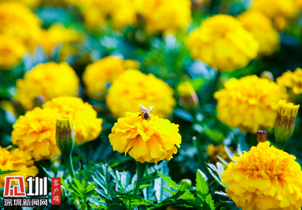 百花爭艷的蓮花山公園,惹來了忙著采蜜的蜜蜂。