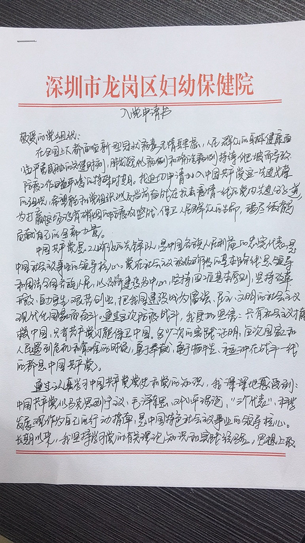 編者按:“在新型冠狀病毒防控工作日趨嚴(yán)峻的特殊時(shí)期,我迫切申請(qǐng)加入中國共產(chǎn)黨這一先進(jìn)組織,希望能和當(dāng)前奮戰(zhàn)在抗擊疫情前線的先進(jìn)分子一道,為打贏這場(chǎng)沒有硝煙的疫情防御攻堅(jiān)戰(zhàn),竭盡所能貢獻(xiàn)自己的全部力量……”這是龍崗區(qū)婦幼保健院中心實(shí)驗(yàn)室羅小金醫(yī)生的入黨申請(qǐng)書,也是他的抗擊疫情的請(qǐng)戰(zhàn)書,更是他以實(shí)際行動(dòng)靠近黨組織的誓言。當(dāng)然,這不是偶然的行動(dòng),也不是心血來潮,而是在成長道路上對(duì)共產(chǎn)黨員先進(jìn)性的長期耳濡目染所致。特別是,在這次抗擊疫情的戰(zhàn)役中,親眼目睹了許許多多優(yōu)秀的共產(chǎn)黨員,他們不怕困難、勇挑重?fù)?dān)、敢打硬仗的大無畏精神,讓羅小金深深感動(dòng),也更加堅(jiān)定了他加入黨組織的信心和決心。