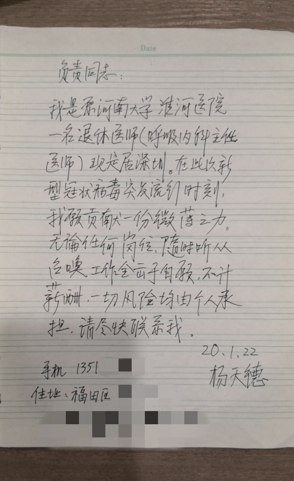 深圳新聞網(wǎng)2月4日訊(見(jiàn)圳客戶端、深圳新聞網(wǎng)記者 邱曉潔)1月23日,福田街道海濱社區(qū)工作站收到一封請(qǐng)?jiān)笗?shū),上面寫(xiě)著:“我愿貢獻(xiàn)一份微薄之力,無(wú)論任何崗位,隨時(shí)聽(tīng)從召喚,工作全出于自愿,不計(jì)薪酬,一切風(fēng)險(xiǎn)均由個(gè)人承擔(dān)。”在請(qǐng)?jiān)笗?shū)的最后,還附上了自己和愛(ài)人的聯(lián)系電話及住址。