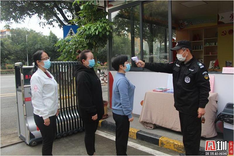 上午8點30分,海樂社區(qū)黨群服務中心社區(qū)工作站的保安正為義工測量體溫。