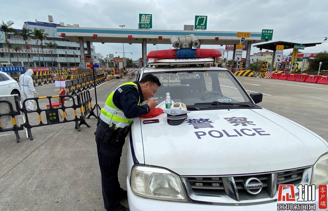 蘇廷源在鲘門高速口防疫檢查站執(zhí)勤,對(duì)進(jìn)入深汕合作區(qū)的車輛及人員進(jìn)行逐一排查。排查途中,蘇廷源抽空在警車旁迅速解決了自己的午餐。(見圳客戶端、深圳新聞網(wǎng)記者羅瑜)