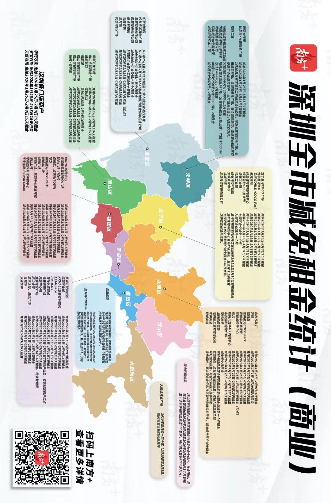 3、鹽田區(qū):對符合條件的商戶減免2、3兩月租金。此次免租政策涉及近40萬平方米經營性物業(yè),惠及租戶230余家,減免租金2000多萬元。