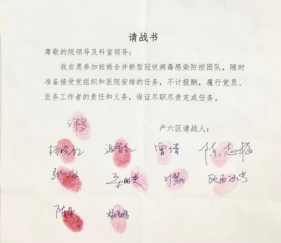 面對疫情,黨員干部紛紛向科室提交請戰(zhàn)書并莊嚴(yán)宣誓,志愿參加疫情防控的阻擊戰(zhàn)。產(chǎn)科共收到200多份請戰(zhàn)書,特別是有三名孕婦請纓,令人動容。請戰(zhàn)人員組成了三個防控梯隊,為醫(yī)院妊娠合并新型冠狀病毒感染防控奠定了強(qiáng)大的人力資源保障。