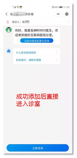 方式二:亦可通過直接掃描醫(yī)生二維碼,添加就診人后可以在診室向醫(yī)生發(fā)起問診咨詢