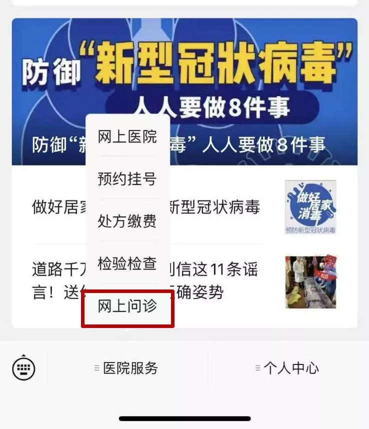 ①關(guān)注“深圳羅湖區(qū)人民醫(yī)院”的公眾號(hào),點(diǎn)擊左下角菜單“醫(yī)院服務(wù)”→“網(wǎng)上問診”