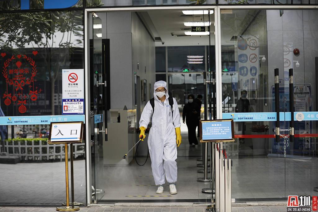 深圳軟件產(chǎn)業(yè)基地的一座辦公樓,一位正在進行消毒作業(yè)的工作人員。