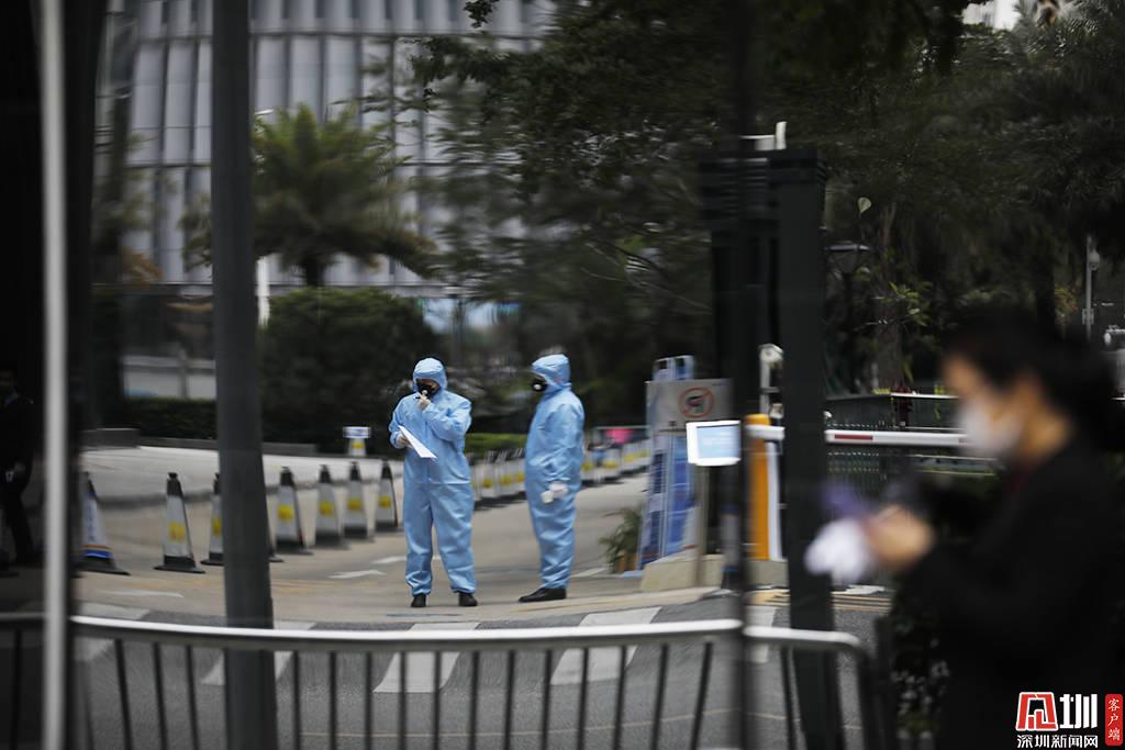 騰訊大廈的一個入口處,工作人員正在檢測體溫。