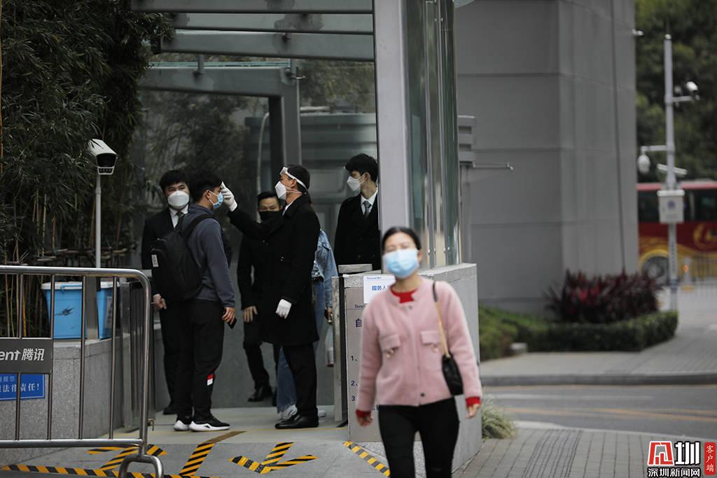 騰訊大廈的一個入口處,工作人員正在檢測體溫。