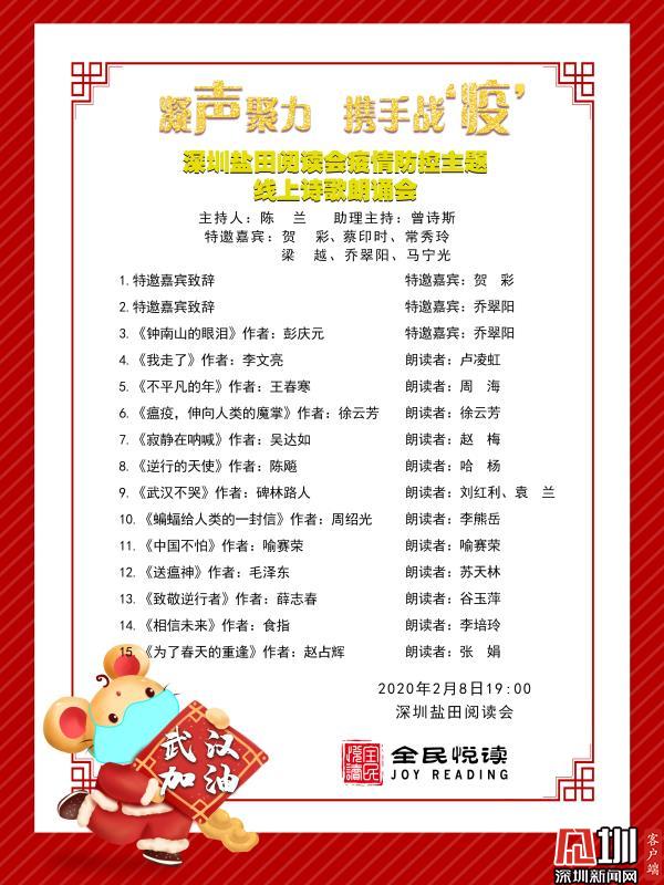 見圳客戶端?深圳新聞網(wǎng)訊(記者 潘峰 通訊員 徐云芳)近日,全民悅讀深圳鹽田閱讀會(huì)舉行了一場(chǎng)“凝聲聚力,攜手戰(zhàn)疫”抗擊疫情線上主題朗誦會(huì),為打贏防控疫情阻擊戰(zhàn)加油鼓勁。