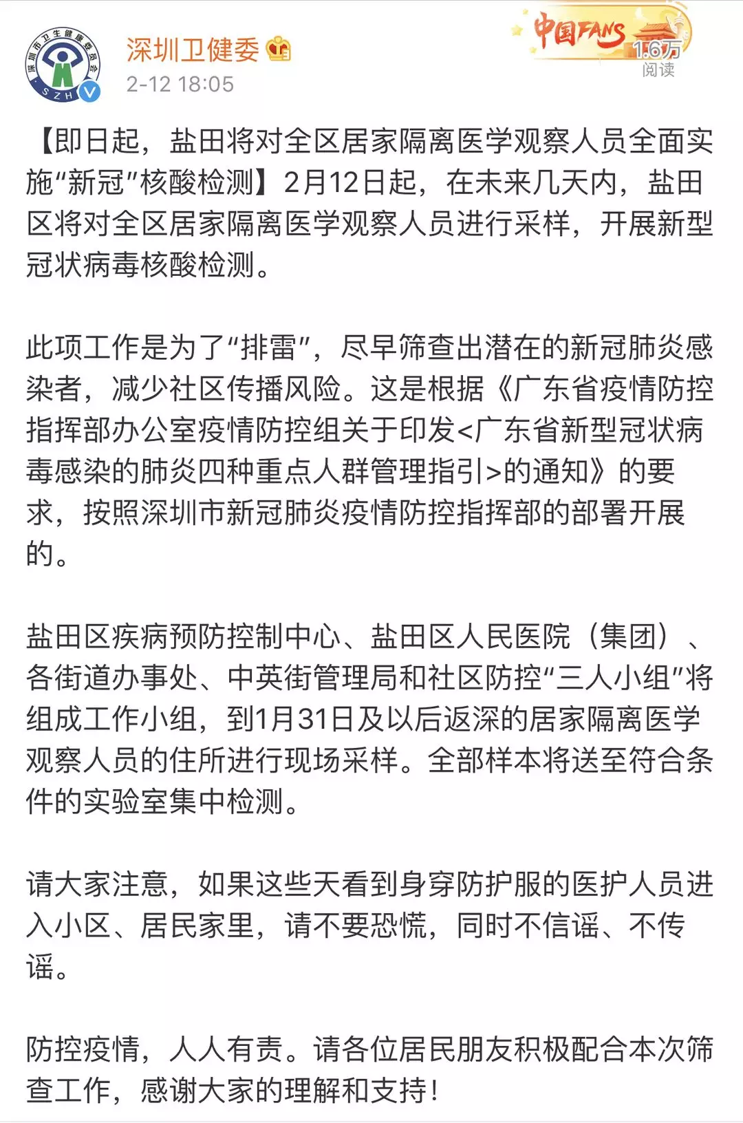 徹底“排雷”!深圳免費(fèi)為所有居家隔離者檢測(cè)“新冠”病毒核酸