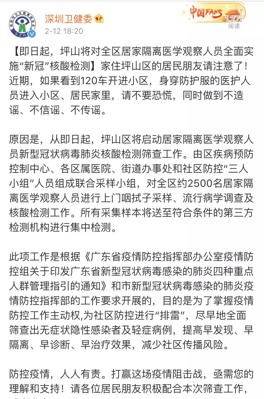 徹底“排雷”!深圳免費(fèi)為所有居家隔離者檢測(cè)“新冠”病毒核酸